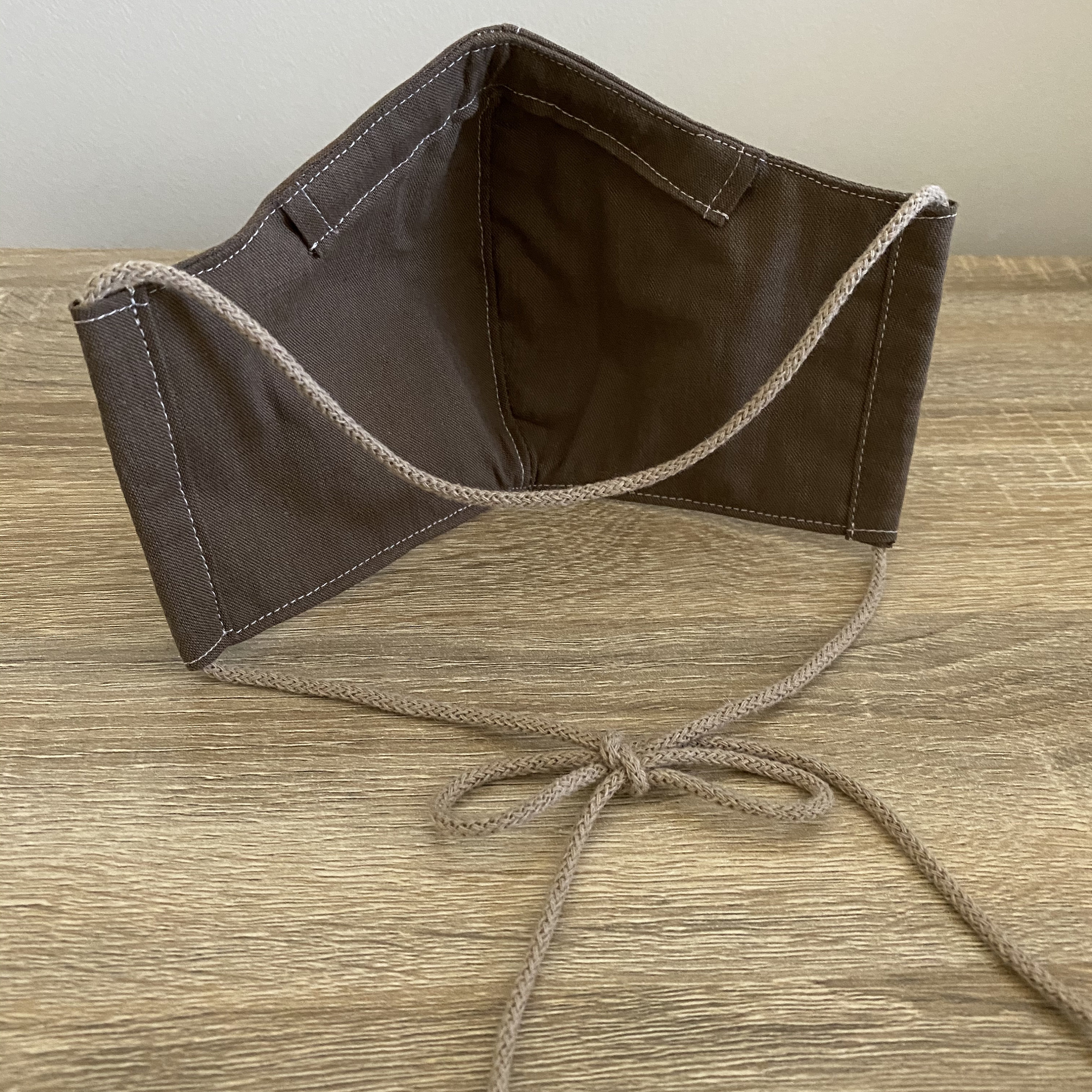 It has an adjustable 100% recycled cotton cord tie which is to be secured at the back of the neck and can be shortened if needed.