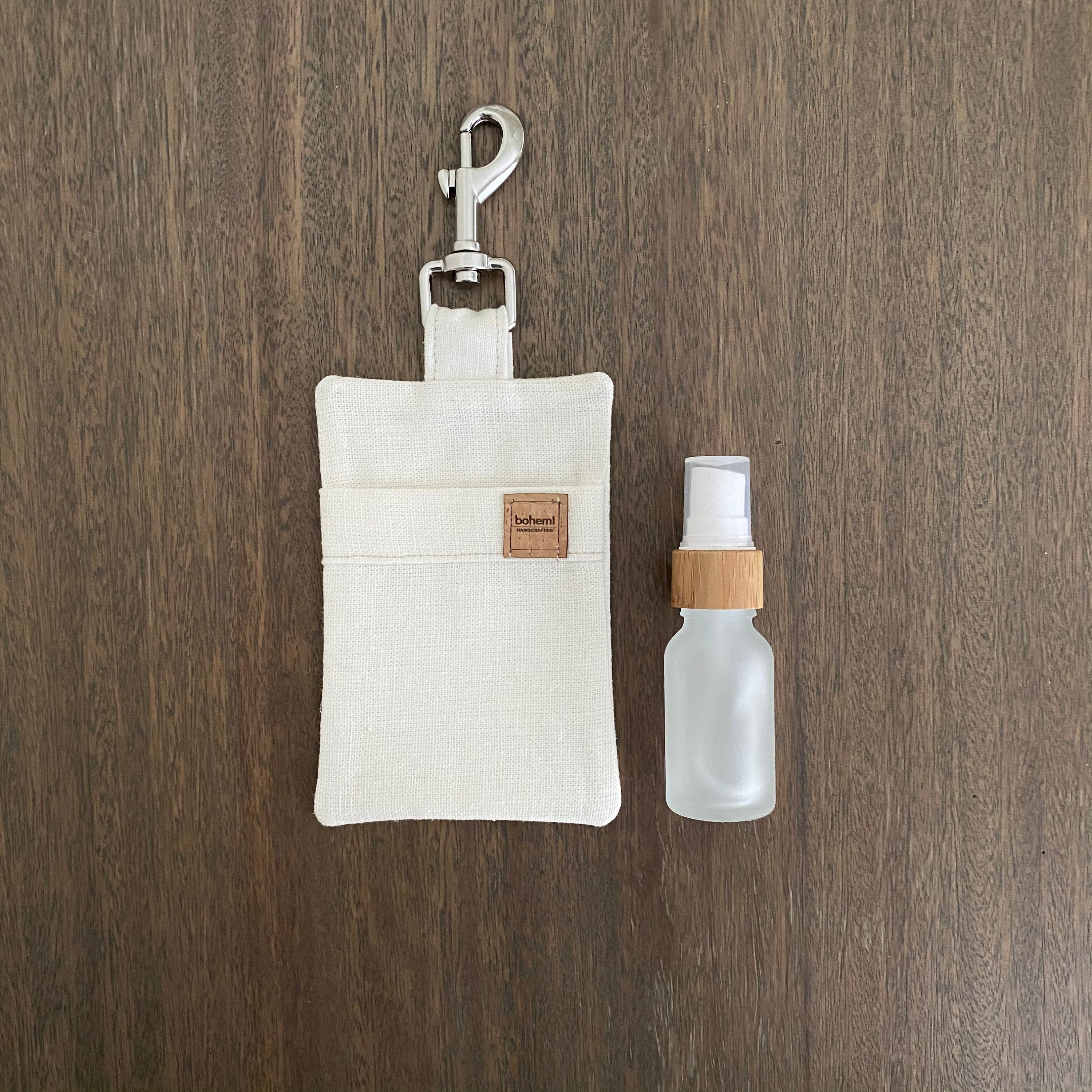 The poo bag mate has a discreet pouch for you to refill with your favourite bio degradable dog poo bags & on the front it features a stylish pocket which fits our 15ml frosted glass & bamboo spray bottles.